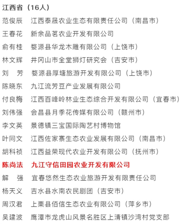 近日,文化和旅游領(lǐng)域傳來喜訊!根據(jù)《文化和旅游部辦公廳關(guān)于印發(fā)2024年度鄉(xiāng)村文化和旅游帶頭人支持項目入選人員和資助人員名單的通知》,在各地文化和旅游行政部門積極推薦的基礎(chǔ)上,經(jīng)過嚴(yán)格的資格復(fù)核、評審以及公示等程序,全國共有468人成為2024年度鄉(xiāng)村文化和旅游帶頭人支持項目入選人員,九江守信田園農(nóng)業(yè)開發(fā)有限公司陳尚法光榮在列!